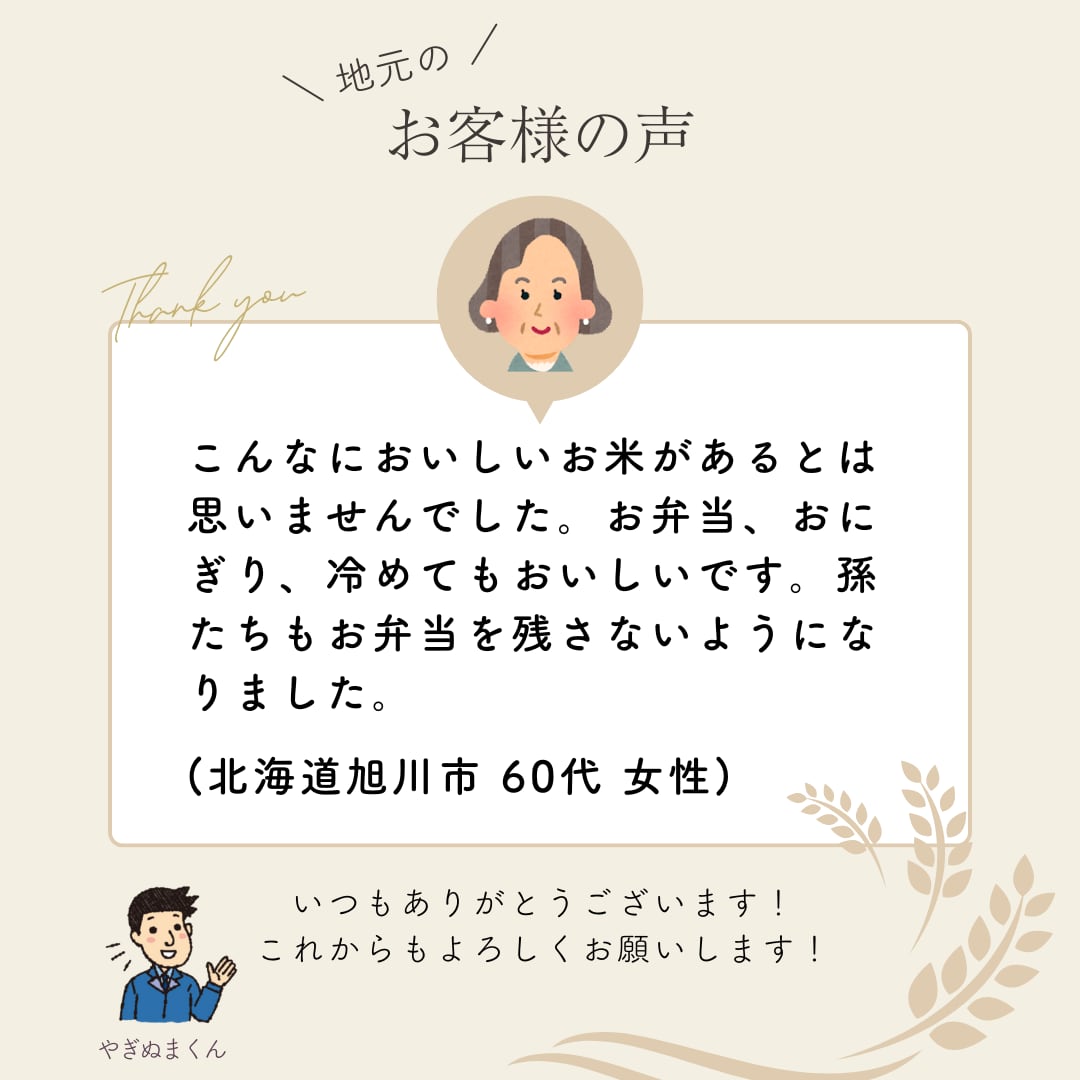 北海道東神楽町のお米屋さん「やぎぬま」が、地元契約農家さんと二人三脚で作った、安全・安心でおいしい農薬節減米です。